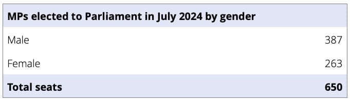 A record number of women have been elected to Parliament in the 2024 election, representing another milestone in the campaign to achieve gender balance in Parliament by 2030. When the House of Commons returns, women will have 263 (41%) out of 650 seats, up from 34% at the last election. 45% of Labour MPs are women, and 24% of Conservative MPs*.