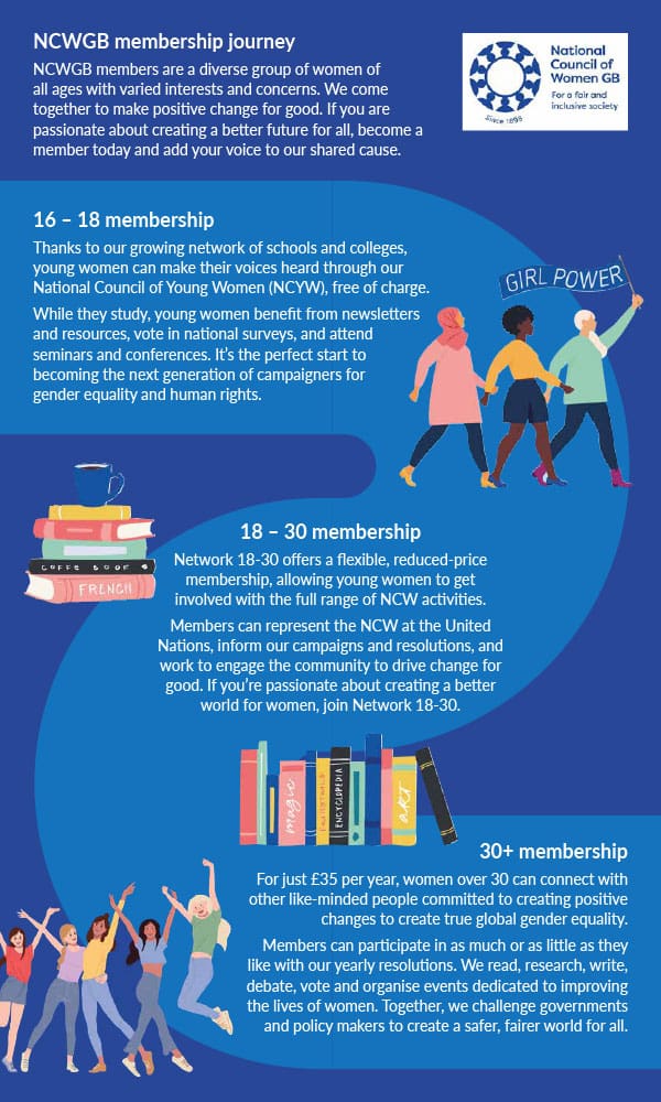 Join as a friend of NCW (both women and men are welcome). As a friend you receive the following but would not have any voting rights at the Annual Conference.